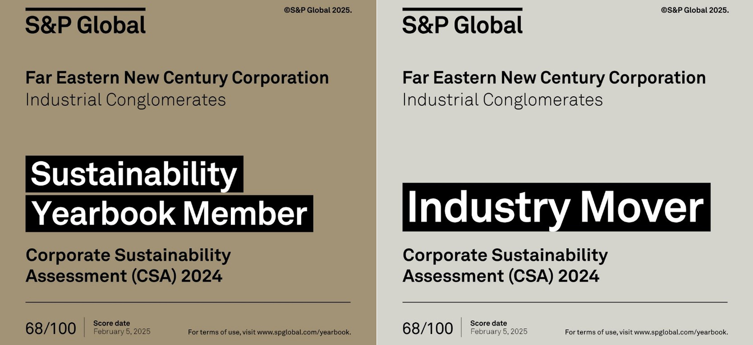 遠東新世紀於2025年2月入選標普全球(S&P Global)《2025永續年鑑》,並榮獲產業綜合企業(Industrial Conglomerate)類別的「最佳進步獎」(Industry Mover)。標普全球永續年鑑針對全球7,690家企業進行ESG綜合評比,僅排名前15%的企業能入選,競爭激烈。遠東新世紀憑藉整體分數提升超過5%,且在產業內表現最為突出,獲此殊榮。未來,公司將持續推動ESG發展,以創新與合作深化永續影響力,攜手全球夥伴共創永續未來。