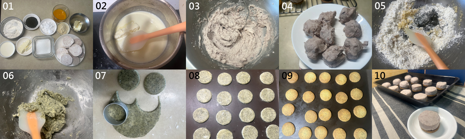 1.芋泥:去皮芋頭200g、去皮紫地瓜65g、動物性鮮奶油65g、細砂糖45g、無鹽奶油20g。