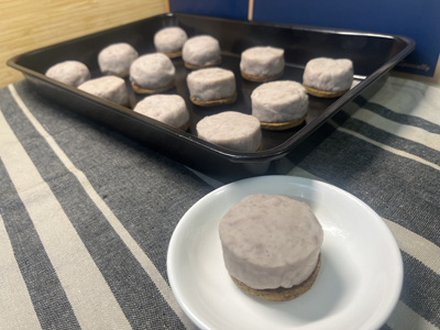 將芋泥球放置在手工餅上即完成。(芋泥球可單吃,惟須冷藏保存,賞味期三天)