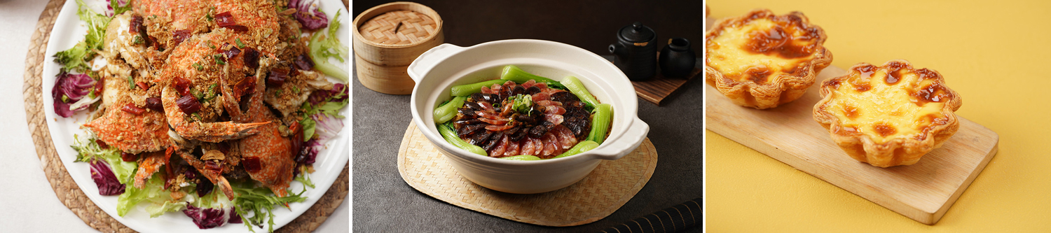 此次《星級料理人:五星港廚盛宴》精選多道極具代表性的菜餚,完美呈現老香港人的飲食記憶。主餐部分,「砂鍋香菇臘味飯」的米粒吸附臘腸香氣與醬汁精華,鍋巴焦香撲鼻;「廣香鹽焗雞」傳承粵式古法料理,雞肉細嫩多汁、皮焦鹹香,帶有淡淡的中藥材香氣。此外,「避風塘辣炒蟹」則是將鮮蟹與黃金蒜酥、辣椒快炒,交織出香辣酥脆的下酒菜;「老港牛雜麵」特別將牛肚、牛筋慢火燉煮,搭配牛腩肉汁湯頭濃郁香醇、港式生麵,是最具庶民情懷的暖心熱食。