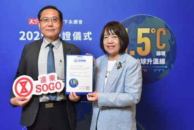 遠東SOGO百貨通過《天下雜誌》「減碳溫度計」平臺評測,以1.495°C的溫控成果,低於百貨業1.536°C的平均值,更遠低於1,200家受評企業的平均數1.998°C,展現公司長期致力永續轉型的成果,獲頒1.5°C標章證書。