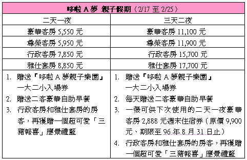 深受國內外旅客喜愛的遠東飯店,地點絕佳、設施新穎,每年春節假期總是吸引闔家出遊的人潮,今年更配合世貿二館的哆啦A夢親子樂園,推出『哆啦A夢親子假期』,除贈送豐盛自助早餐外,再送一大二小入場券,讓住客的台北之旅絕無冷場;遠東飯店另安排了其它物超所值的專案,消費者住到等於賺到!欲洽詳情或訂房,請電專線(02)2376-3266或email至reservations.tpe@shangri-la.com。
