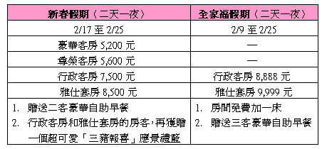 除各假期專屬權益外,房客還可免費使用溫水游泳池、三溫暖、健身房、房內每日致贈新鮮水果盤、二瓶礦泉水、早報、以及享有免費停車…等貴賓禮遇;以上房價皆需外加一成服務費。